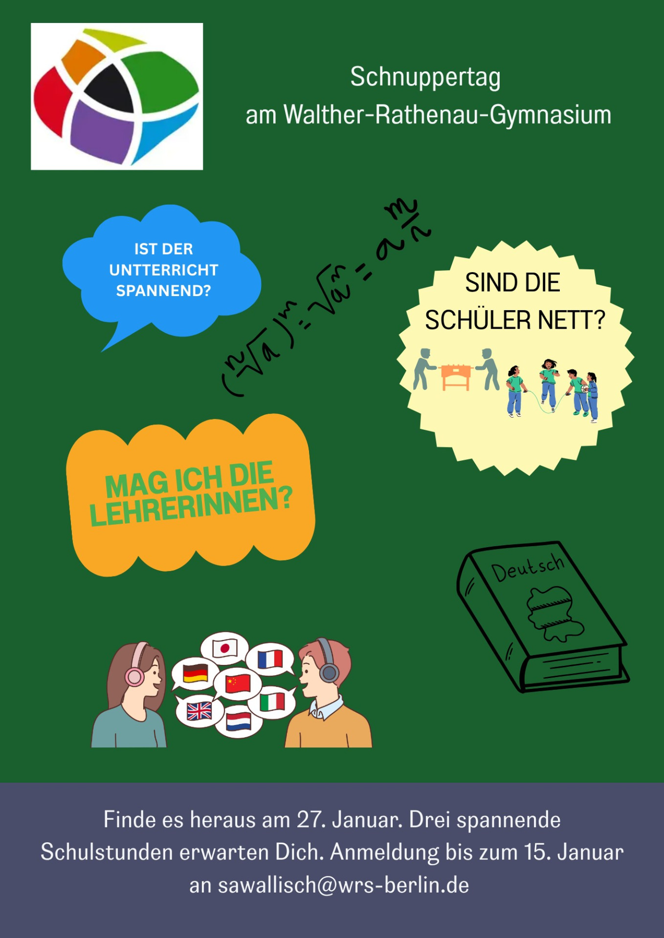 Manches probiert man am besten aus. Zum Beispiel, wie es hier an unserer Schule ist, die auch bald Deine sein könnte. Ab jetzt startet wieder die Anmeldung für unseren beliebten Schnuppertag. Wie läuft das ab? Von der zweiten bis zur vierten hast Du drei Stunden Unterricht, nämlich Deutsch, Mathe und eine Fremdsprache Deiner Wahl. Dabei lernst Du natürlich einige unserer Lehrerinnen kennen, die Schüler aus der 7. Klasse, was man auf dem Schulhof machen kann, unser schönes Gebäude, also alles, was man braucht für einen Eindruck von unserer Schule.