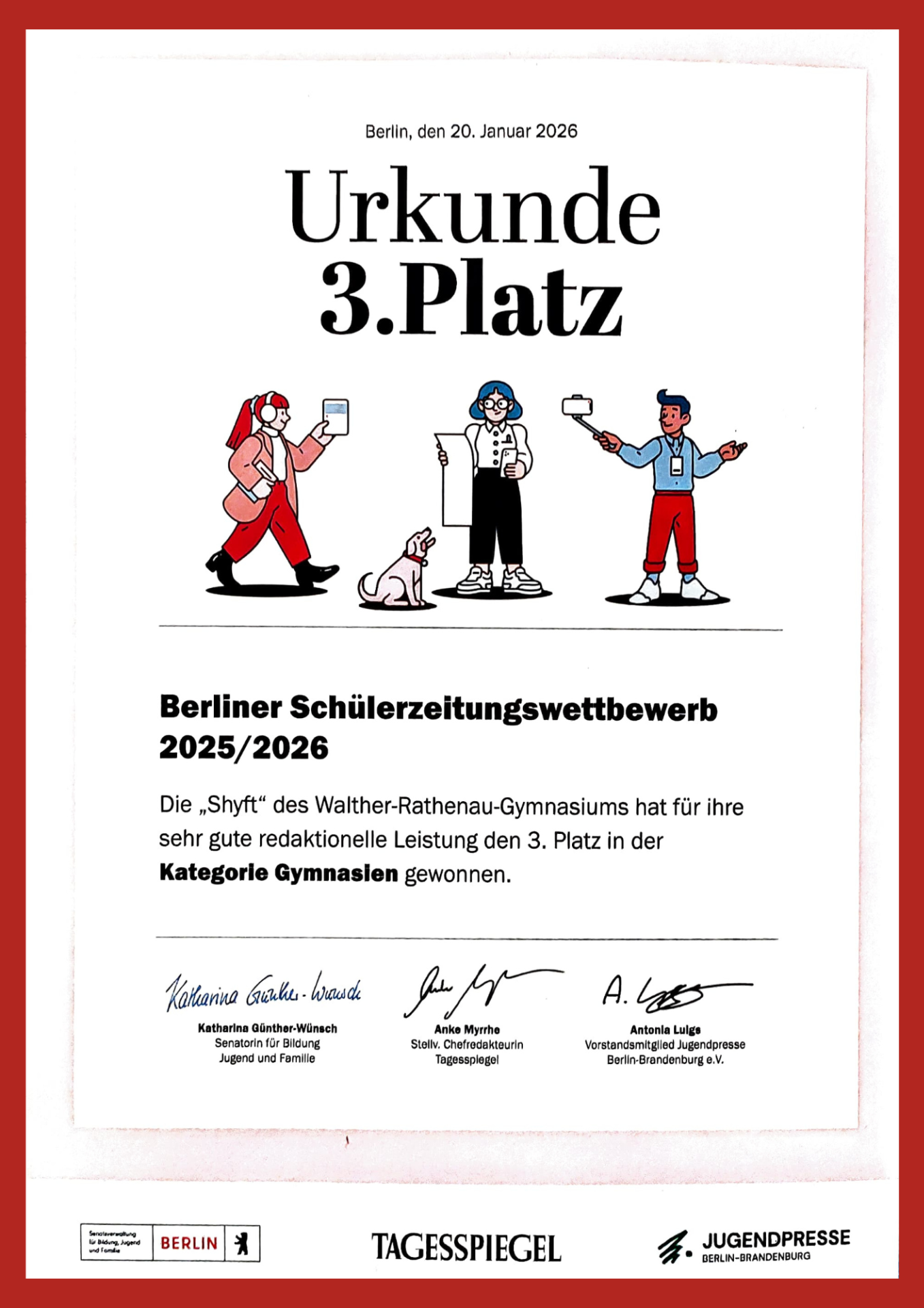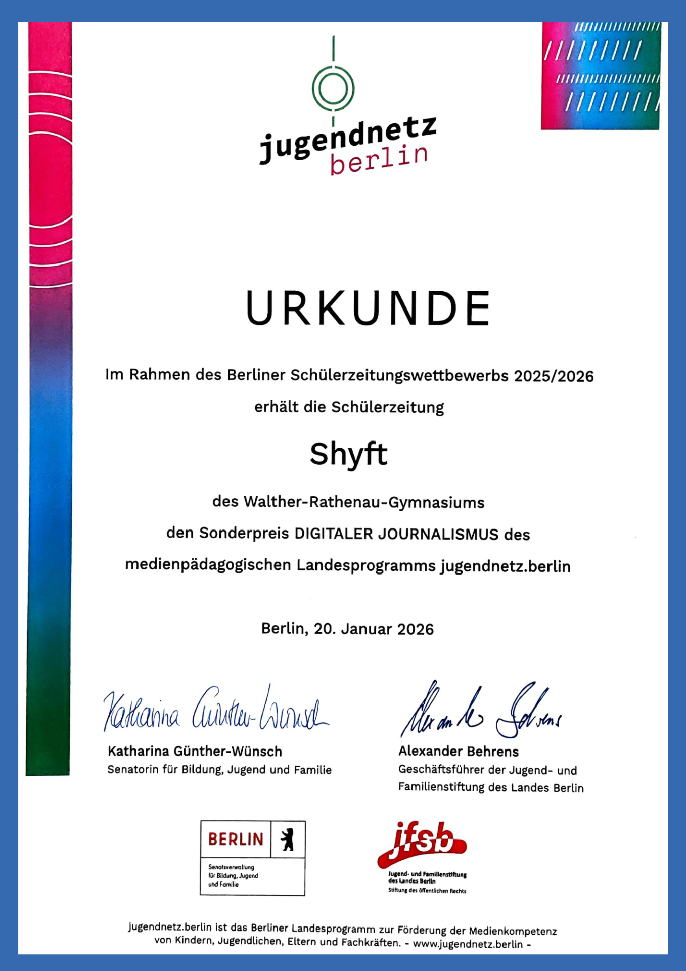 Im Schülerzeitungswettbewerb 2026 gehörte die Shyft (wieder) zu den besten Schülerzeitungen Berlins. Sie wurde in diesem Jahr gleich zweimal ausgezeichnet.